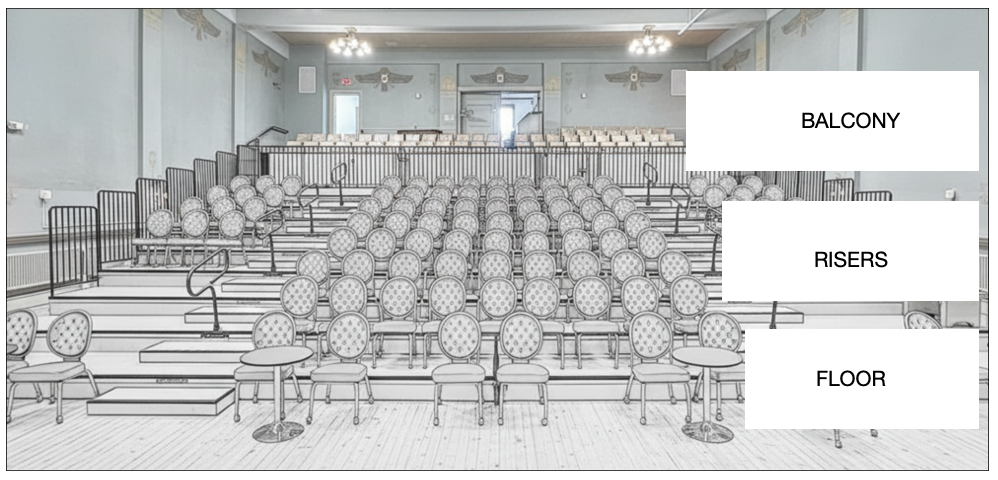 Rows D–K are chairs on risers and are only accessible by stairs.