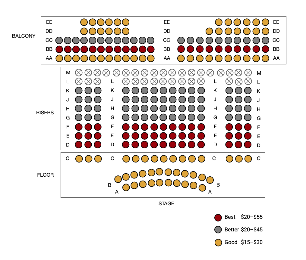 The seating chart shows you the entire layout. To choose your specific seats at the performance you plan to attend, follow the link to buy single tickets or season passes.